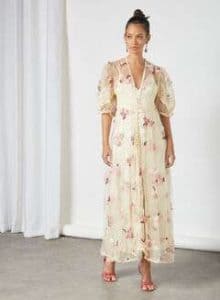 شيفون جذاب بطبعة الأزهار الراقية يمزج بين اللونين البيج والكشمير، ومن أكثر ما يميز هذا الفستان أنه مناسب لكافة أشكال